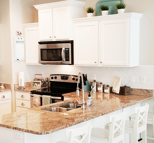 So, in our townhouse, I was dying to put up some cute Moroccan trellis tile. But our builder grade granite 4″ backsplash was in the way. This was something where I bought all the stuff but ended up hiring a handyman to install. He showed up to remove the 4″ lip granite and turns out the counter top was not perfectly even with the wall. Basically, the builder knew that the counter wouldn’t need to line up perfectly with the wall, because it would be covered with the backsplash lip that sat on top. The problem is when you want to take that off to install real backsplash, there is a big gap. Sooooo we put it back up and just did plan B. Backsplash on top of the lip. I know…most people say this is a major no-no. But This wasn’t our forever home and I think it still turned out okay. It gave the kitchen more white so I was happy. Details on the faucet and board and batten to come……