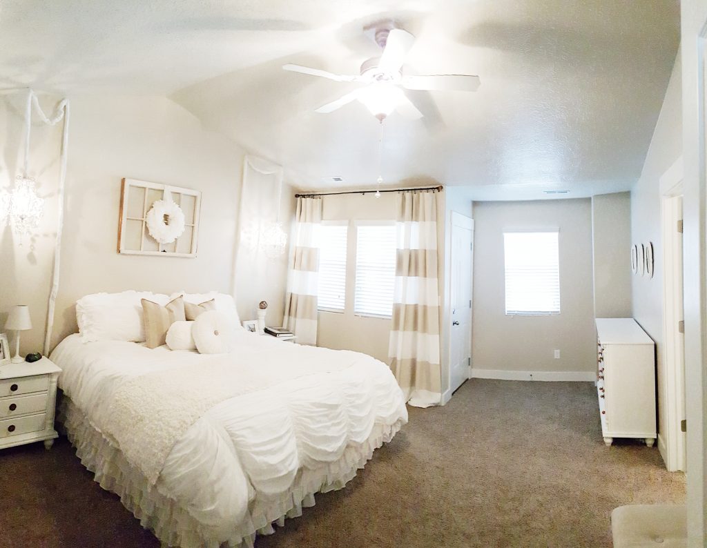 As you know from my post about the stripes on my entry, I kind of have a thing for stripes. So when I needed curtains for my master bedroom , of course, I wanted big stripes. The only problem is any curtains of 96″ with stripes are sooooo expensive . Let’s be honest, my sewing skills are not that great either so you know I wasn’t going to even try sewing them. That leaves paint. Yup , hat’s right, paint! The best place to get long , inexpensive curtains is IKEA! I purchased a pair of plain white curtains and got to taping off my stripes. That was fun! Try having a one-year-old and six-year-old stay out of the dining room while your taped curtains take over……ummmm yeah. I used the same method as I did for my entry wall. A big long level and light pencil mark all the way across then put my tape over the faint pencil line. Next is the fun part….paint. And it will take a lot, let me tell ya….those stripes were thirsty :). After a few coats of paint, (put plastic down under because it will soak through to your floors) I let them dry nice and good overnight. The next morning I had crispy curtains.lol Once I hung them and put them into the shape I wanted, you couldn’t tell they were that hard/crispy. So what are you waiting for? Go get some curtains from IKEA and get to painting! Also, my bedding is from Target. The square accent pillows and rolled pillow are from IKEA. The round decorative pillow with the jewel is from Ross. The blanket on the end of the bed is from IKEA too ( I love that store). This darling ruffled bed skirt is from Wal-Mart. If you need any more details just email me or leave a comment!