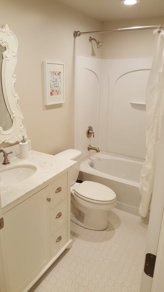 You will also see my elliptical poking out in a few pictures. Hey, a girl has got to work out sometimes too. The bathroom was probably my favorite room in the house. The octagon and dot tile was from Home Depot. I chose white grout because it was going to be a bathroom that didn’t get much use. I also sealed the grout to be safe. The vanity and faucet also came from Home Depot. That cute framed print came from a seller that was on groupdealz.com. I printed it straight off my computer and it was only two dollars. The shower curtain also came from Target. I will probably use it in the kid’s bathroom at the new house (I can always bleach it, right?). However, I don’t think I will get away with using those pink towels (also from Target) in the kid’s bathroom. It would work for my daughter but not my son. I will have to find something gender neutral since they will be sharing a bathroom at the new house.