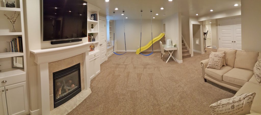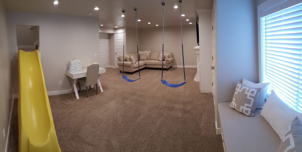 Ok, today I’m showing you how the basement in our townhouse turned out all finished. I absolutely loved being down there and so did the kids. As you can see from the pictures, the kids were most excited about having a slide and swings in their basement. That is one of the first things they would tell people. They just loved having friends over to play. Even without friends they enjoyed playing together on the swings and slide. It was actually convenient because I also loved the space and being down there so much too. All of my craft and sewing stuff was hidden in the closets. I could just pull out my stuff and work while they played. Functional, beautiful, and kid friendly is exactly what I wanted and that is what I got!