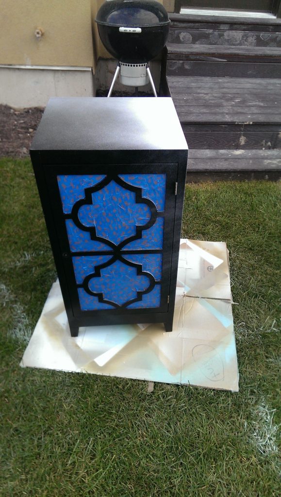 I brought my last ditch effort home to see if it fit. (I should have measured the space before I went on a wild goose hunt). IT FIT! I was so excited that it fit and it matched the trellis rug I had in my living room. I became more and more upbeat about this. The first thing I did was grab some wood glue and a nail gun to put the leg back on. Next came the tedious task of taping off all the mirrored front. That was not so fun.