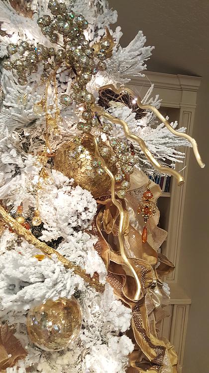 These ornaments were red and some were brown. They are all now beautifully gold on this amazing flocked tree. Don’t they look dreamy? Ok so start by laying down some cardboard or plastic so you don’t get paint on your garage floor. Next, grab a can of Krylon metallic gold spray paint. Use a back and forth motion. Don’t just spray all over the place like its hair spray (Im making a youtube tutorial on my technique and I will post soon). You may want to invest in a spray paint can grip handle. Its only a few dollars and it fits right on top of your spray paint nozzle. It will save your finger from dying while pushing the nozzle the whole time. WORTH IT! These ornaments weren’t even primed first. Just use nice even strokes back and forth with the gold spray paint. Let the area you paint on the ornament dry. Once it is dry then roll it over to the side that didn’t get paint and cover it with spray paint. Once it is nice and dry (12 to 24 hours) , you can place them on your tree. And just like that, you have brand new color scheme for Christmas while only buying some spray paint. Also if you want to add some glitter while the spray paint is wet (it will dry and the glitter will stick) on the ornament; it will look great too!