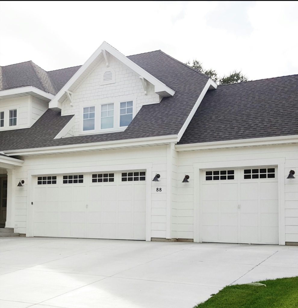 We were driving though a neighborhood and came to a house that I yelled, “Stop, turn around and drive slow.” It was a glorious white house that was just my style. Of courseI did that slow drive by stocker look. You know, where I take a million pictures as we slowly drive by. It had hardy board, shaker shingles, AND it was all white. We will have the same windows on our garage but the door style is a little different. I don’t love the outdoor garage lights. Who cares when your house looks that dreamy? They did a version of the carriage style hardware by only doing the middle handles.