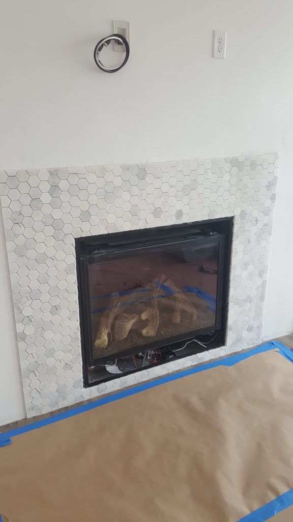The fireplace tile was a splurge. Like I said in my design options post, marble is high maintenance. I wanted it in the master bathroom but it was not going to work for me in a wet area. The upkeep of marble in a shower is daunting to me. So, I got my marble around the fireplace with no upkeep. It still needs grout and a mantel.