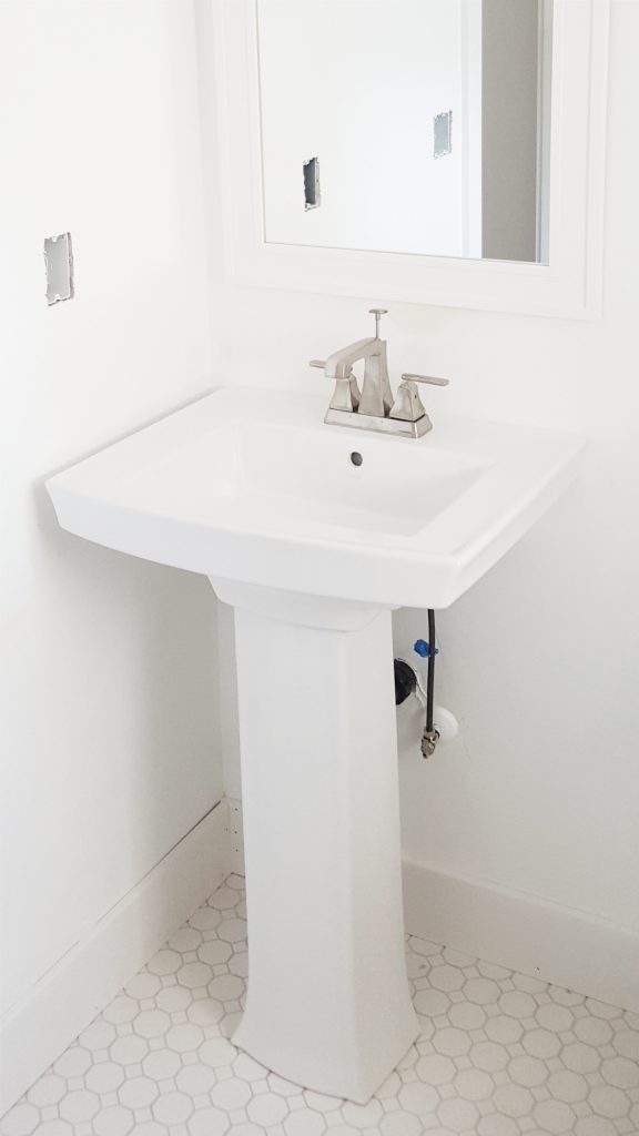On Instagram, I posted all the half bathroom sink options a long time ago. I ended up choosing this beauty. I am really happy with this look. This bathroom still needs baseboards painted and a few other things. I will switch out this mirror for a super cute one I found at Home Goods.