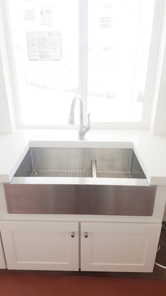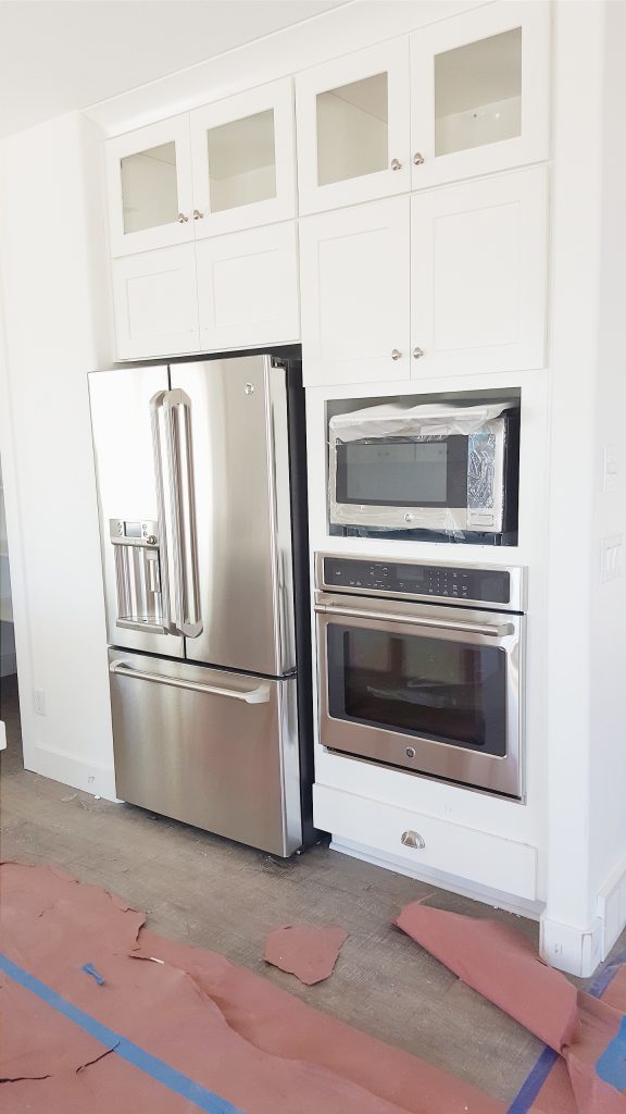 The appliances got delivered and I can not wait to get cooking in this kitchen. We went with GE Cafe series. Here is shot of them sort of installed. They are just sitting in their spots but haven’t been fully installed and pushed back yet. You get the idea, though. Can we talk about this sink? This is what dreams are made of ( at least mine). My favorite part is this low bridge divider. We will be switching out the faucet for a spring pull down one. This faucet will get moved up to the laundry room sink.