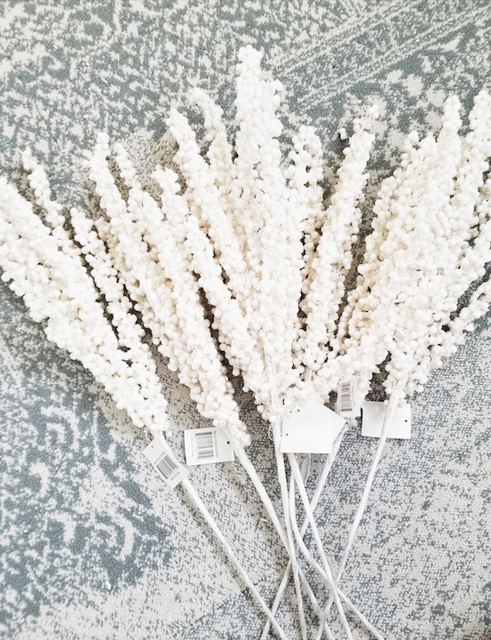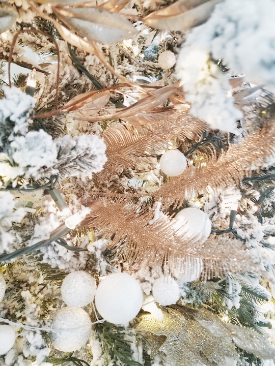 Step 3- Now, I take my fillers and spread them through the tree. I use decorated sprigs, flowers, and twigs. I sometimes bend the end or just stick it straight into the tree. Super easy and it can fill the empty spaces on a sparse tree making it look fuller.