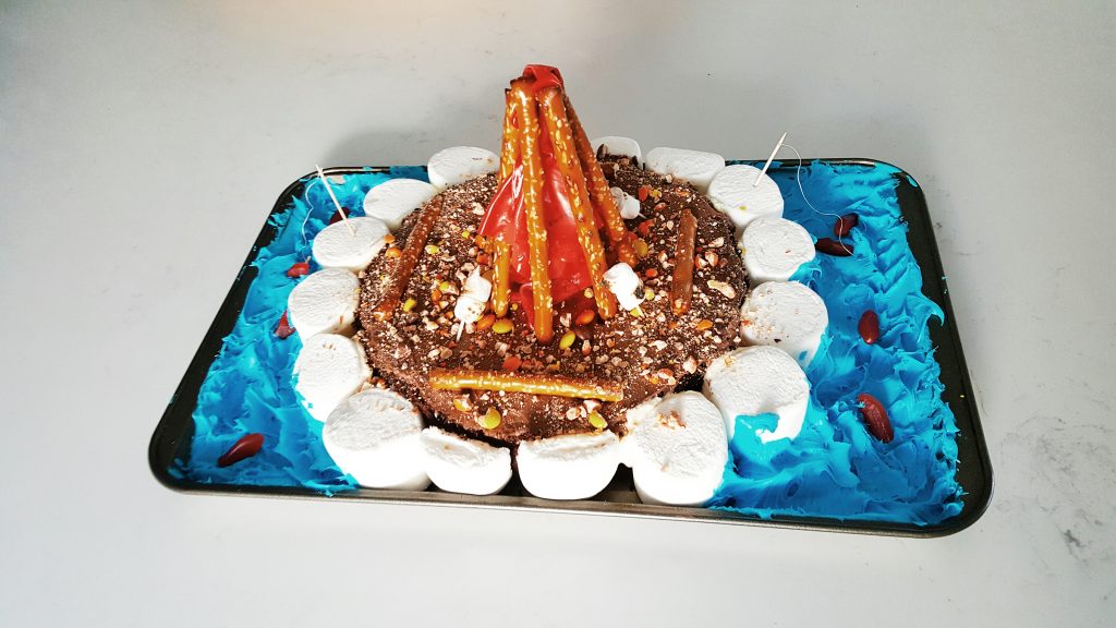 Mr. Whitelane and our little one got busy putting chocolate frosting across the top. Then they took white frosting to stick jumbo marshmallows around the outside layer of the cake. Next came the Fruit Roll-Ups for the campfire “flame.” It took some teamwork to hold the Fruit Roll-Ups in place, while the other stuck the pretzel rods in to hold up the “flame.” This sweet little duo of guys in our house came up with the idea to use some extra pretzel rods for benches around the fire. They then sprinkled Reese’s Pieces around the fire (some crushed up). They also took mini marshmallows (roasted in a flame for an authentic look) and stuck them to toothpicks to place around the “fire.” Mr. Whitelane and our son could have stopped there. It looked great! But, they decided they needed to add some fishing with the campfire. Blue icing around the outside of the marshmallows served as the “water.” They tied a string to toothpicks (fishing poles) and placed Swedish fish in the “water.”