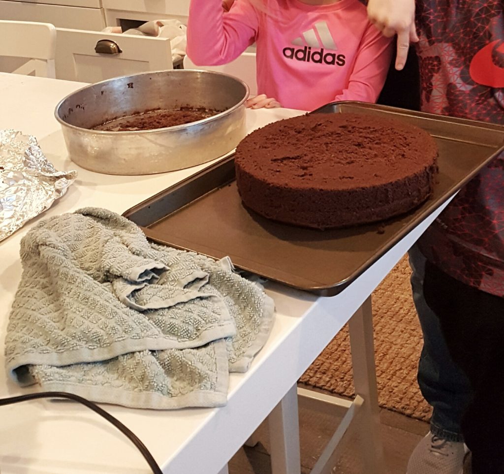 They started with a simple chocolate cake mix from a box. The secret is to add a package of instant chocolate pudding, into the batter, to make the cake extra moist. They followed the directions according to the box except for that extra secret ingredient. When the cake came out, they wrapped it in foil and stuck it in the freezer overnight (makes it extra moist). The next day, they let the cake defrost and started decorating. The idea they saw here, gave the basis for their masterpiece. Don’t mind my poor quality photos. I didn’t plan on sharing this but it just turned out too cute!