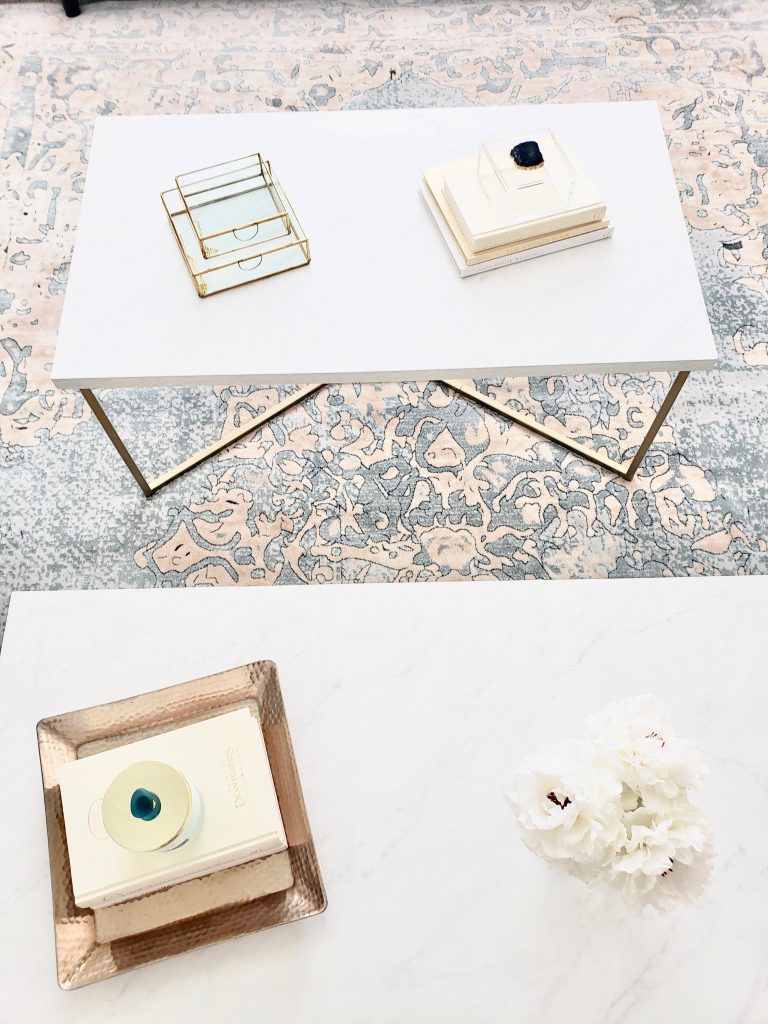 Do you like the touch of light blue the rug brings to the room? I think It is a great addition to blend with all the white. I am also loving how well the subtle blue pairs with the gold accents. Walking on this rug is literally like being on a cloud. It is low pile but also really plush.