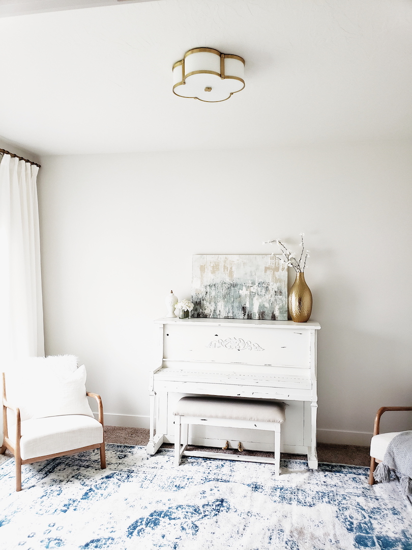 But wait there is more. 🙂 The front room had to get its own ceiling jewelry. This front living room is a lot smaller than in our previous home. However, it still fits the piano and a few chairs. It really works for our little family. Now, to fully appreciate the after you have to see the before. The previous owners used this room as a toy room. There were dome lights everywhere. A classic staple in tract homes. WHY!? They are the worst. Well, guess what? There is the cutest little flush mount that coordinates (in my opinion) with the Sweeny pendant.