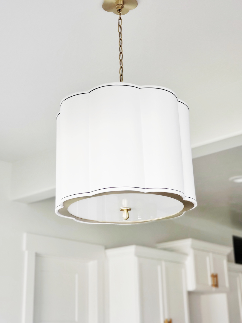 Ok, let’s talk about the gorgeous elephant in the room. I have said it a million times but lighting can make such a huge impact on a space. You can take a builder basic house and transform it into a curated home by just swapping out a few light fixtures. It really does make a statement and sets the tone for the rest of the room. I knew that Hudson Valley Lighting was my go-to for the dining room. I found several gorgeous contenders but then I stopped dead in my search. There it was, the perfect pendant. The Sweeny. Isn’t she a beauty? Look at those scalloped curves and perfect pinstripes. The aged brass chain and plate cover is the icing on the cake. I could go on all day about this pendant.