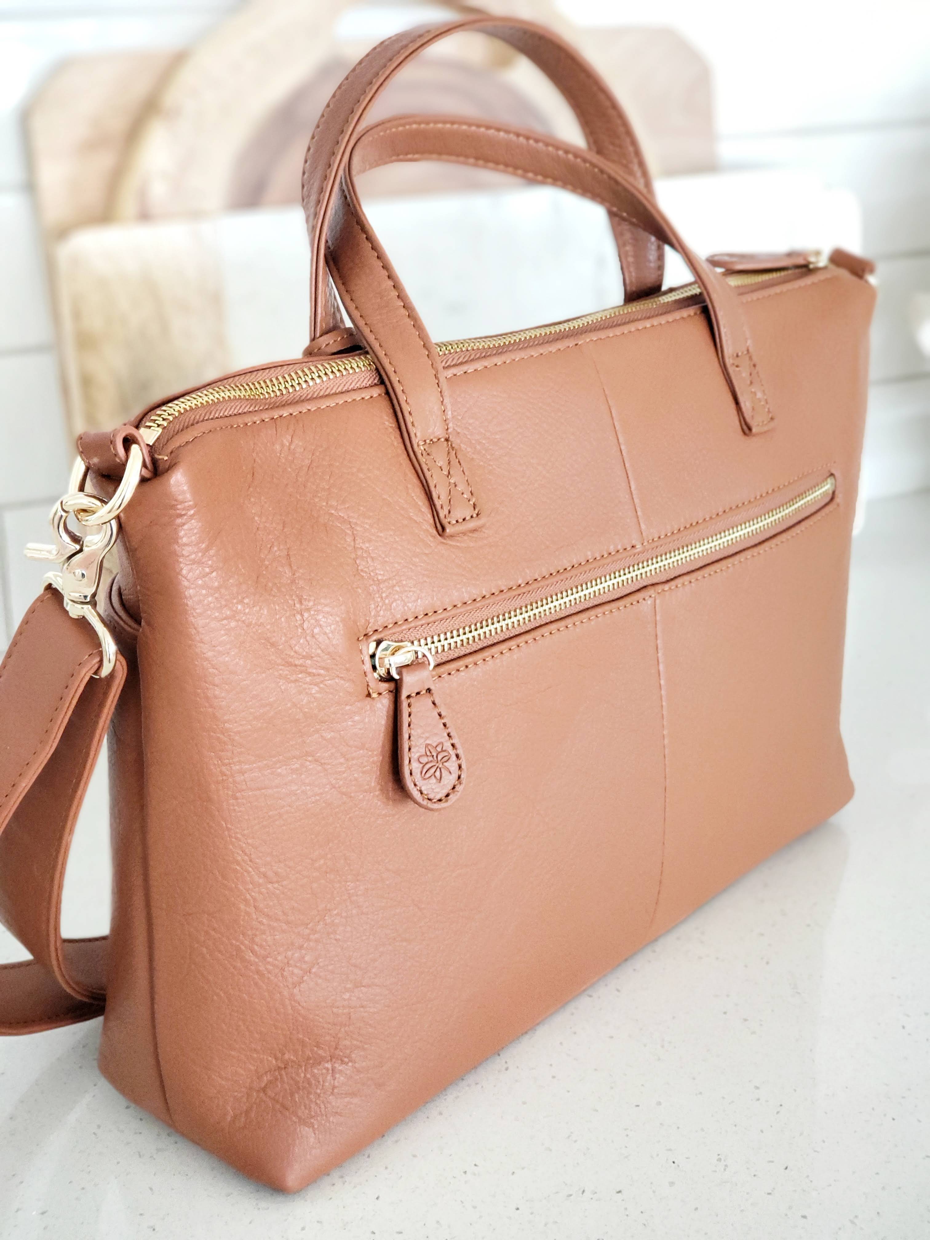 The natural tanned leather and gold details are stunning! The signature Jade lining is still a fun pop on the interior that I love. Don’t let the size fool you because this bag can still fit an iPad and iPad mini. The petite handle strap is a fun way to carry this bag when I have free hands with no kids. 🙂 My favorite way to carry Danielle is with the adjustable, detachable strap. I can carry it as a messenger bag across my chest or on my shoulder. Again, Lily Jade has thought of everything when it comes to the design and functionality of their bags.