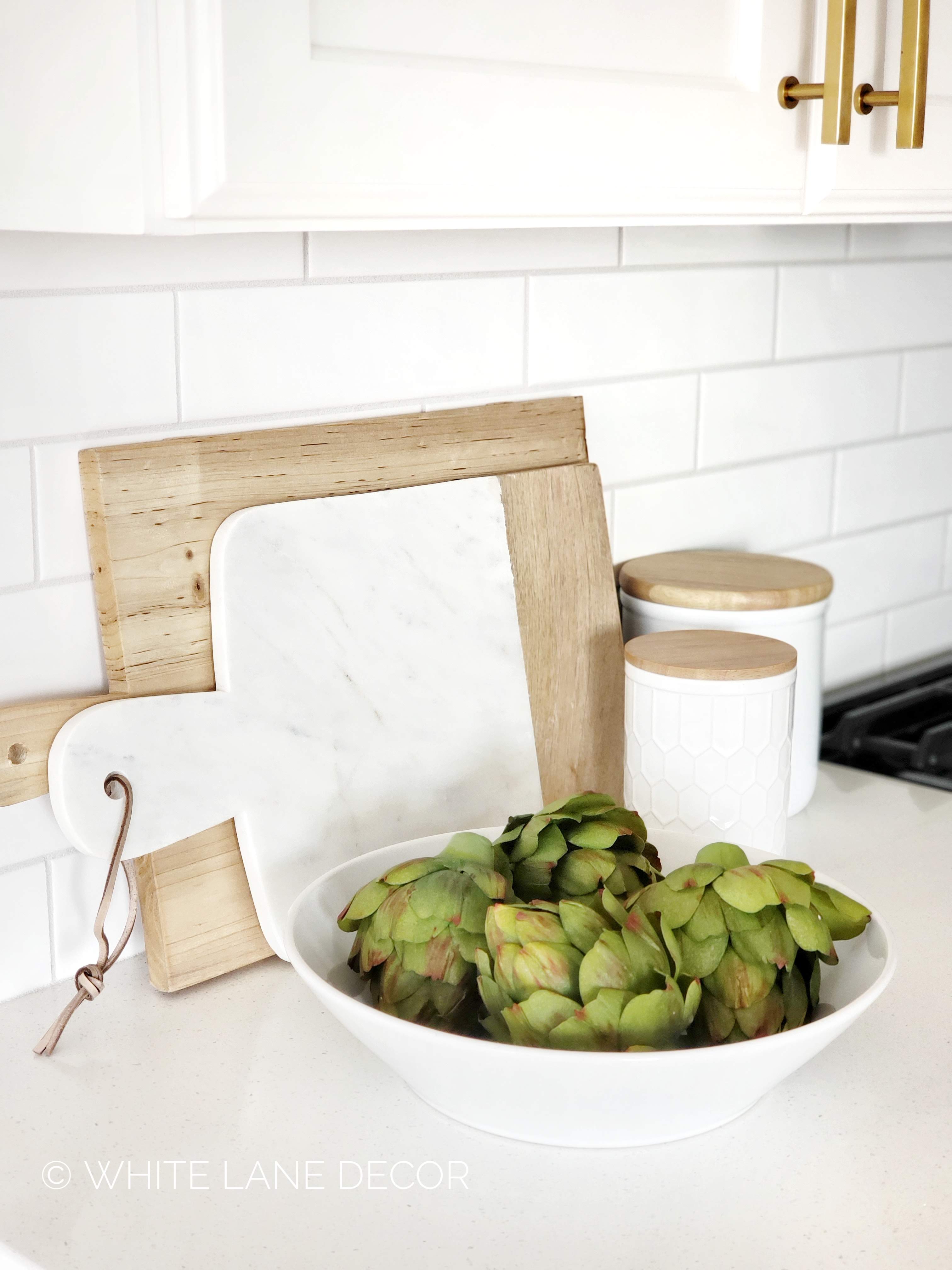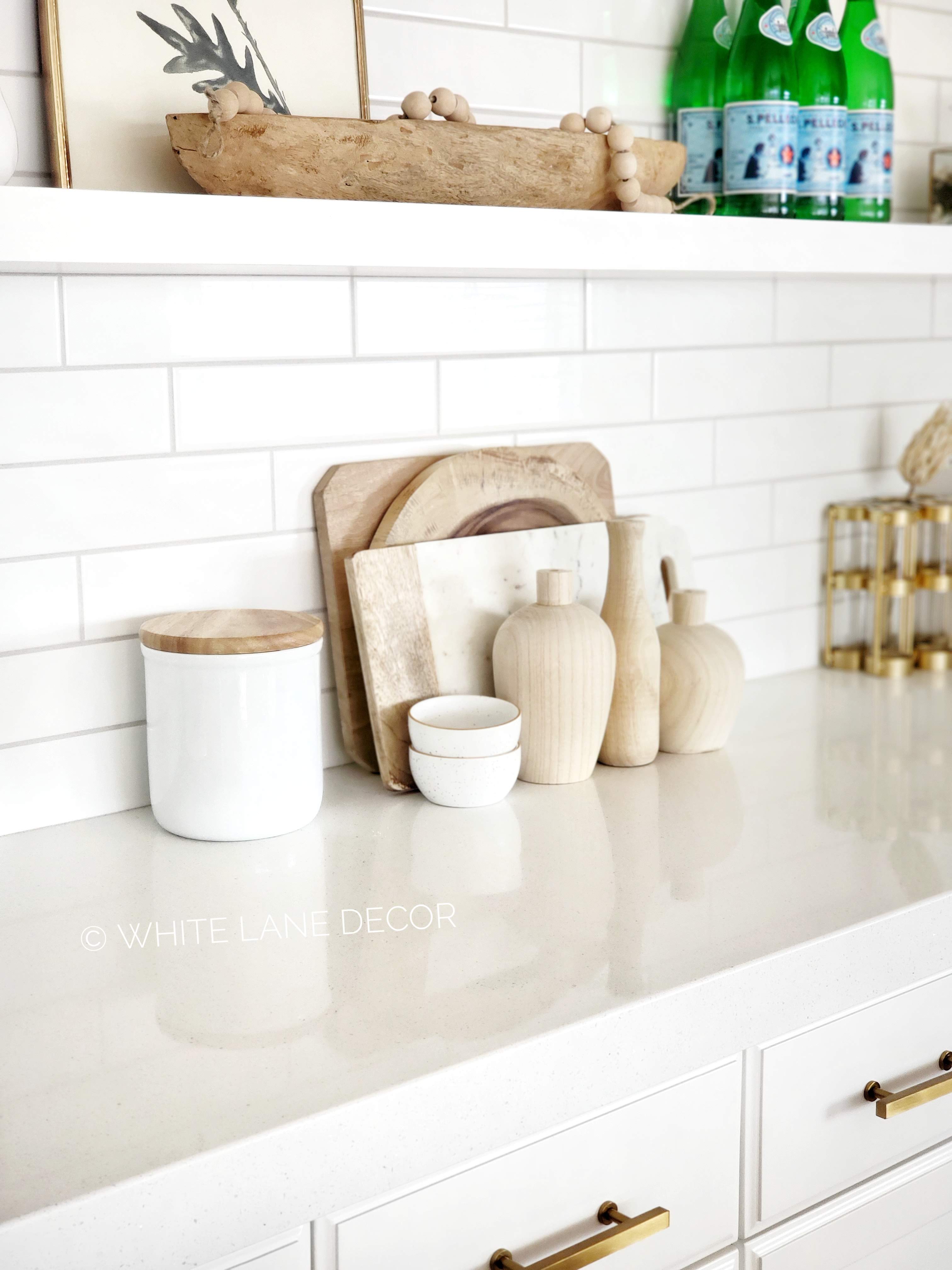 I also had to get a new runner that fit with my new changes. I am a neutral loving girl at heart. I have tried out many different options for this space but I always come back to my neutrals. This rug is so great because it has a rubber backing to help keep it in place. This Tillia marble cheeseboard is a must-have for countertops. The wood and marble together make such a beautiful statement. I filled in the rest of the counters with these awesome white canisters. They come in two sizes and I went with the ten-inch size. I even removed the lid to use one as a utensil holder. Finally, I found this wood vase set. I am obsessed with these vases. They can be used in so many applications for styling. A great staple to have around for any room.