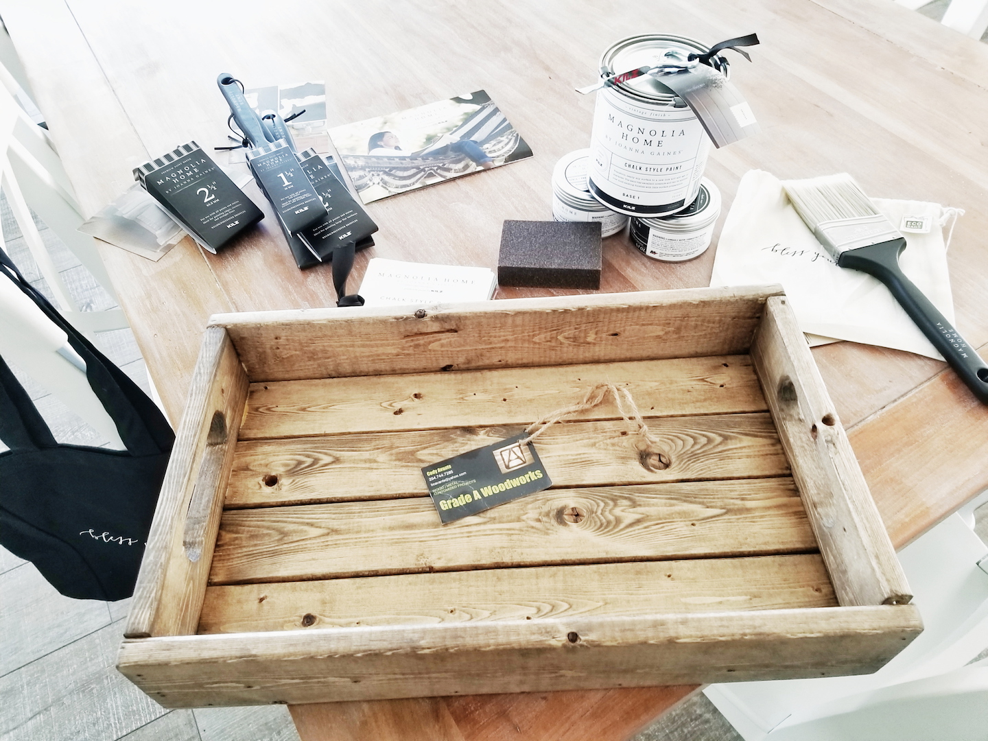 I was beyond excited when I received this happy mail! KILZ and Magnolia Home sent me this box full of goodies to try. KILZ recently partnered with Joanna Gaines to make a line of chalk style paint, wax, and brushes. As part of the goodie box, they were so kind to also send me an autographed book, bookmark, apron, cute bag, wooden crate, and a sanding block.