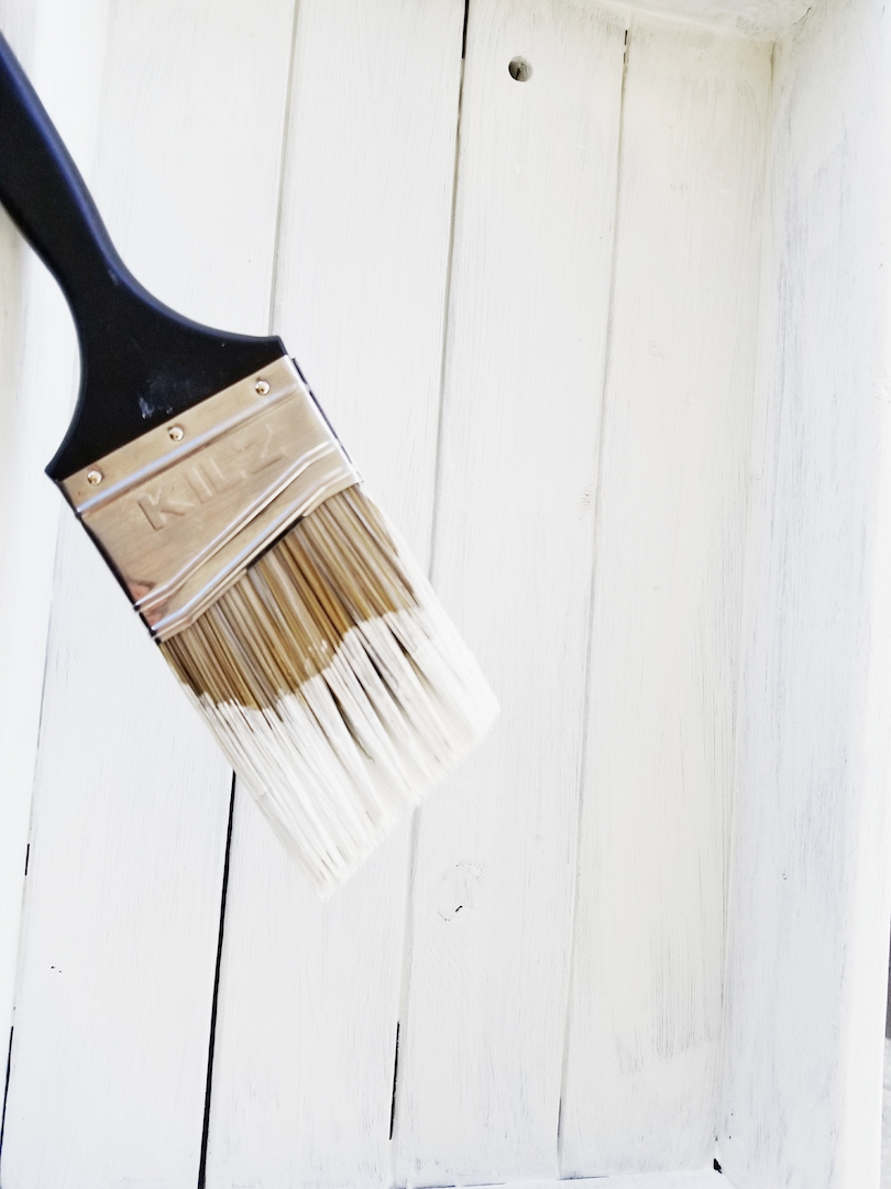 Ok, back to the chalk paint. I was so excited that KILZ was working with Magnolia Home to make this paint. We all know how much I love my KILZ spray primer. It is my one and only go-to primer for all my projects. I just love their products. I knew that this would have to be a good paint if it came from KILZ. I was excited to dive in and test it out. The color they sent me is called Shiplap. It is a beautiful white color. Not too gray or yellow. A really soft and true white in my opinion. I received this cute wooden crate that was made from a local Waco Texas artisan. The crate came stained and I honestly had a hard time bringing myself to paint that beautiful wood. I love white and I knew I would love it painted just as much. I have done a lot of chalk paint projects in my DIY years. Including my piano that I ended up using my own homemade chalk paint to finish.