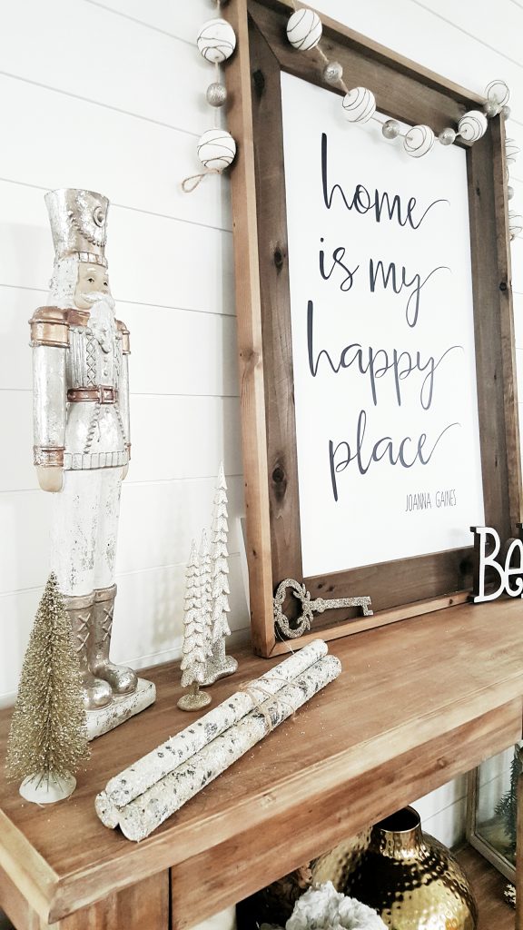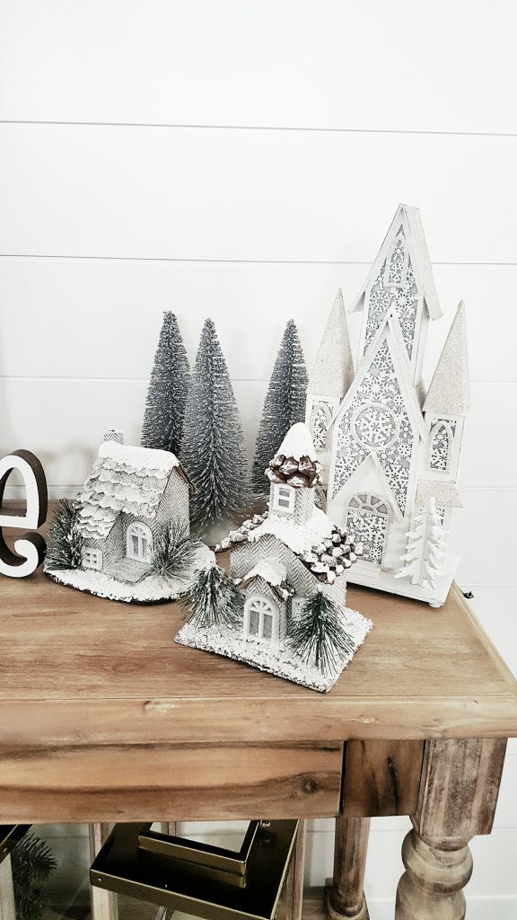 I took tons of pictures because I wanted to share all this Christmas cheer. I had to decorate my entry table. A lot of the decor I have had for years. Some of the decor I got on clearance after Christmas in years past. The big nutcracker and glitter key is from Tai Pain Trading. The set of glitter logs are from At Home Furniture. All the gold and silver bottle brush trees are from Target dollar spot. The believe sign and other Christmas trees on the table are from Hobby Lobby. The smaller village houses are from Michaels and the larger is from Wal-Mart.