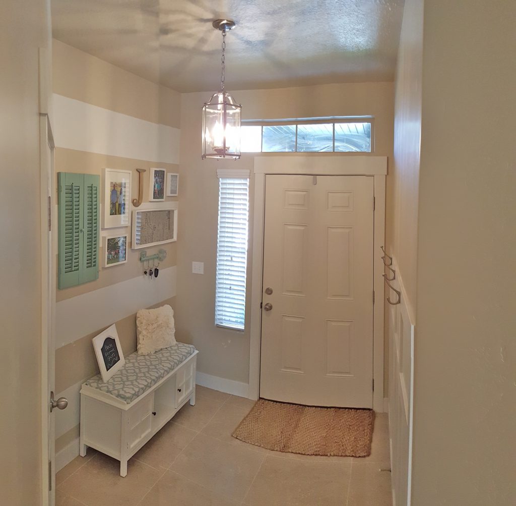 One of my favorite spots to decorate is my World Market Everett Table. Easter and Spring are when I venture out and add some color around the house. I picked up this egg garland and grass bunnies at Michael’s. The wreath was a Home Goods find. My husband refers to this as the hallway of shiplap. I just love the character that shiplap gives our entry.
