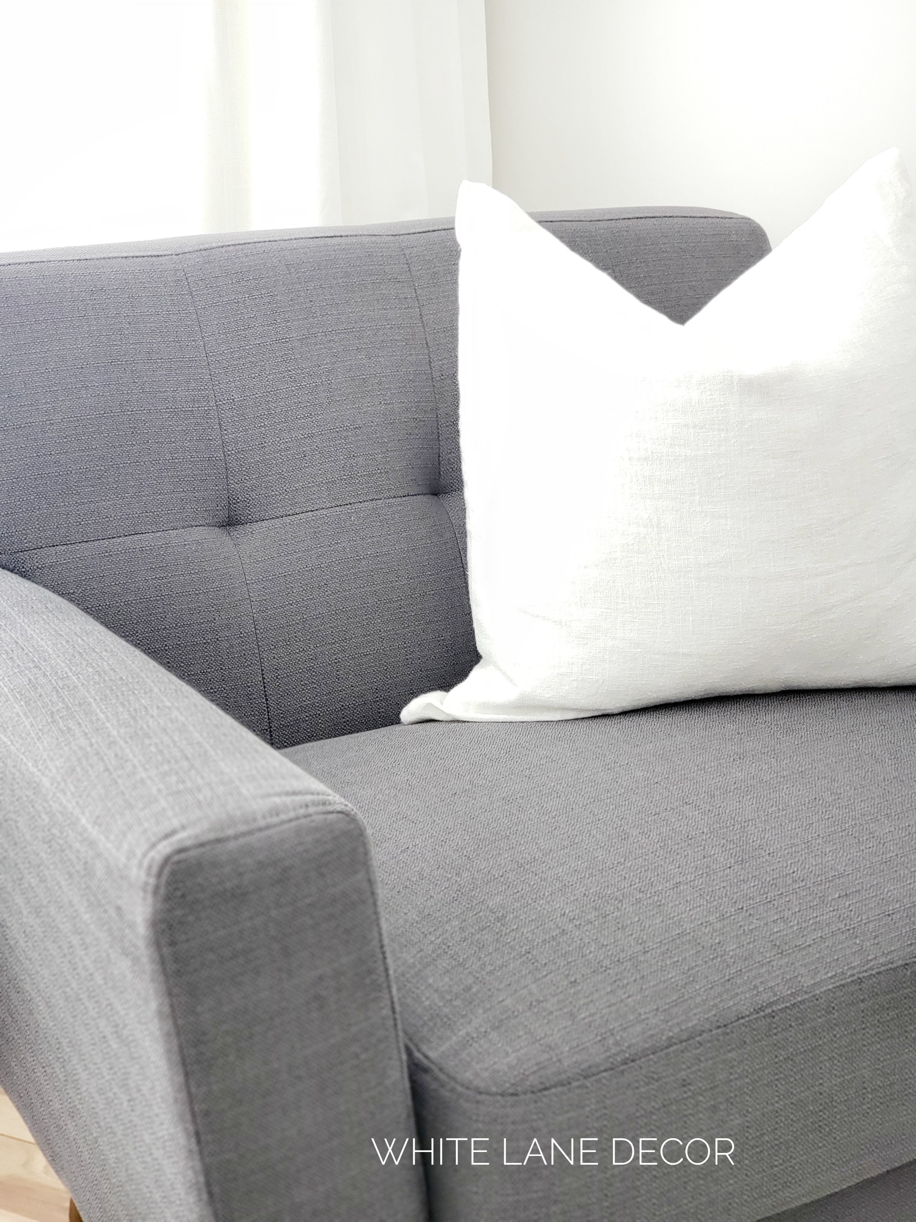 I love the wooden detail legs and the linen fabric. So much character in this little chair. What do you think? I am actually loving the grey. That moody color pops against the light wall color. The tufted back creates the perfect amount of depth and dimension. Also, this cute modern beauty is pretty comfortable.