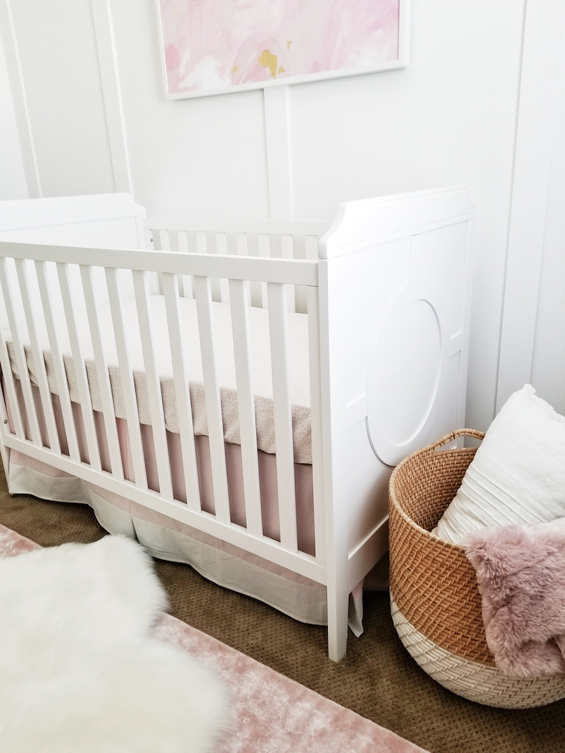 I centered the room around the crib. When I found this crib, I knew it was the one. I love the simple clean lines with the side details. It is a 3-in-1 convertible crib that will last a while. The crib comes in multiple colors and the price was amazing too! After I found the crib, I knew the wall behind it needed some sort of trim. I decided to stick with a simple clean look by doing vertical boards. You can read more about the wall here. I found the cute basket and blanket at T.J. Maxx. The crib bedding was an easy decision. My mother-in-law usually makes my kid’s crib bedding. It is phenomenal when she is done! However, I came across Carousel Designs when they were having a sale. The prices were too good to be true. You can design your own custom bedding and see it in a virtual nursery. It is really fun and they send you free fabric swatches. I found the perfect shade of pink in a simple design that I really liked. I decided to buy the crib bedding this time around and I was pleasantly surprised.