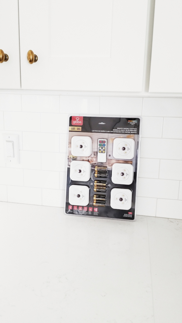 They come with six pucks in one pack with a remote and batteries. I ended up using four packs for a total of twenty- four pucks. Guess what? One remote can control all of them! I don’t have to use a different remote for each package. They all link up to one remote. It really makes things easy. I am so happy with how they look in our kitchen. I will definitely be using more of these for all the places I wish I had put a light!