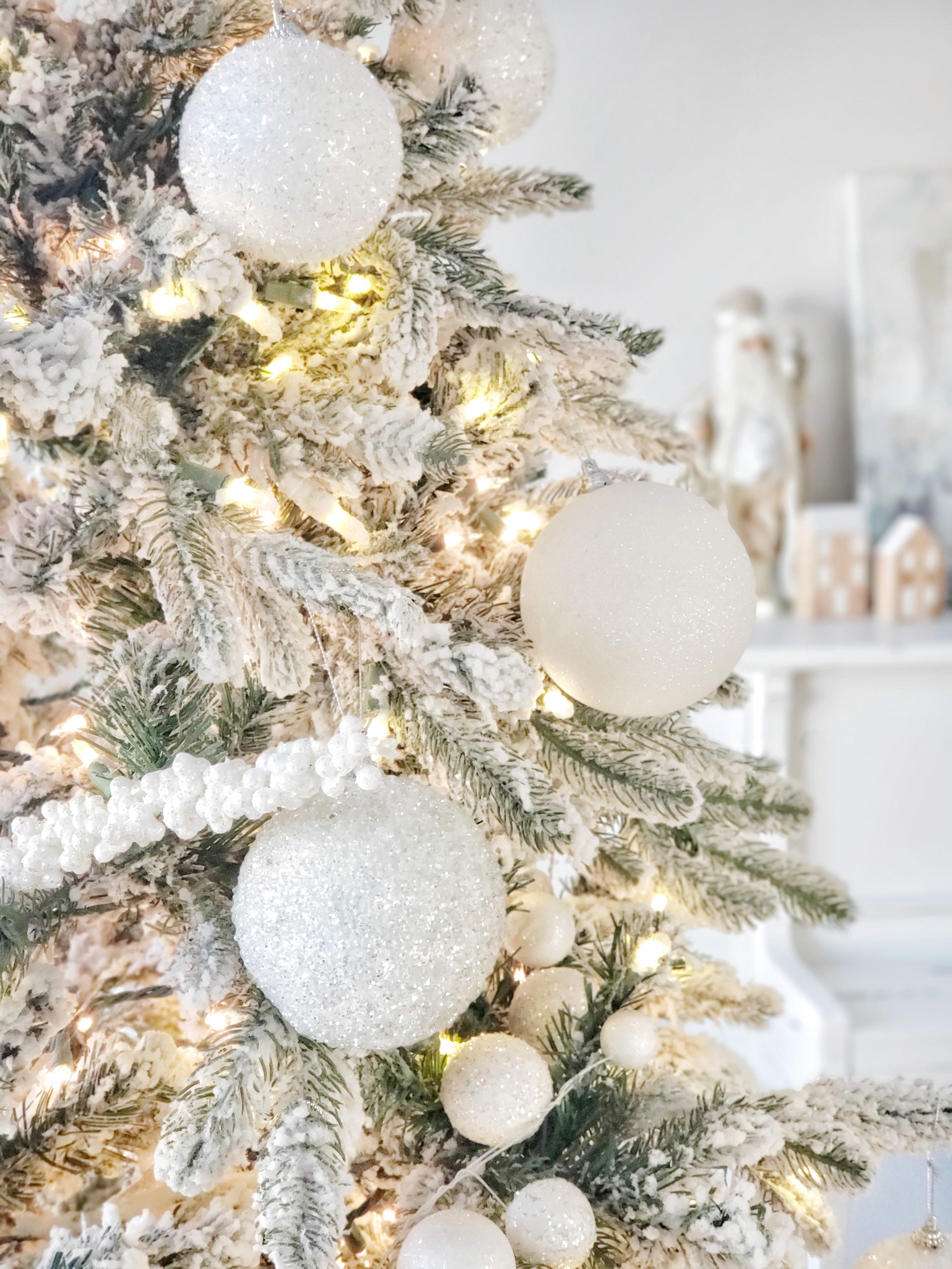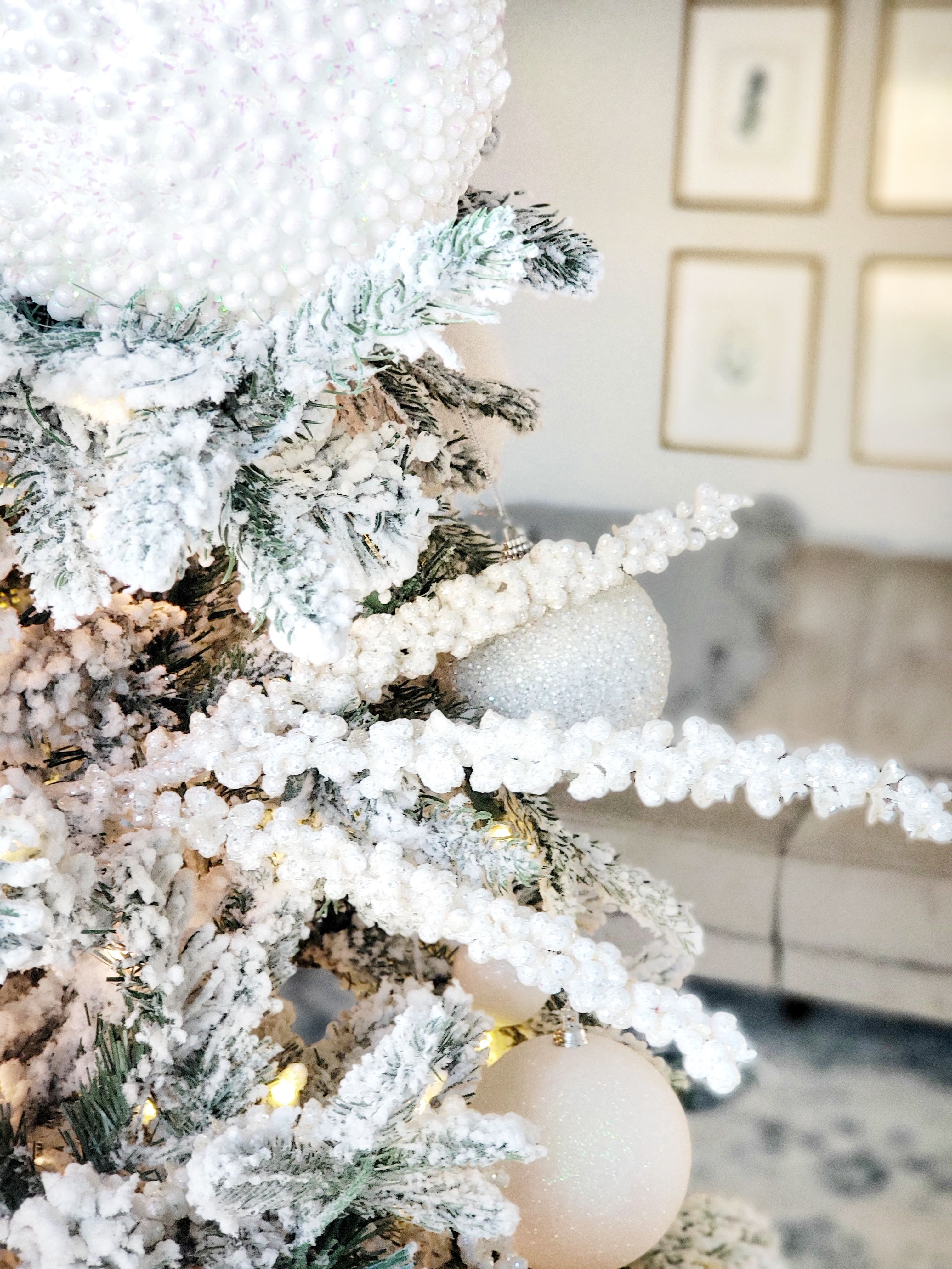 I am so proud of myself for just using what I had when it came to the tree. I went all white and simple. I had all these white ornaments and picks. I usually have a jam-packed tree with more layers of ribbon and ornaments. This year I just wanted simple and less. It still looks very full because this flocked tree is naturally thicker. Maybe next year I will splurge for a thinner and simple looking tree. I did find this tree collar basket and like it much better than a skirt.