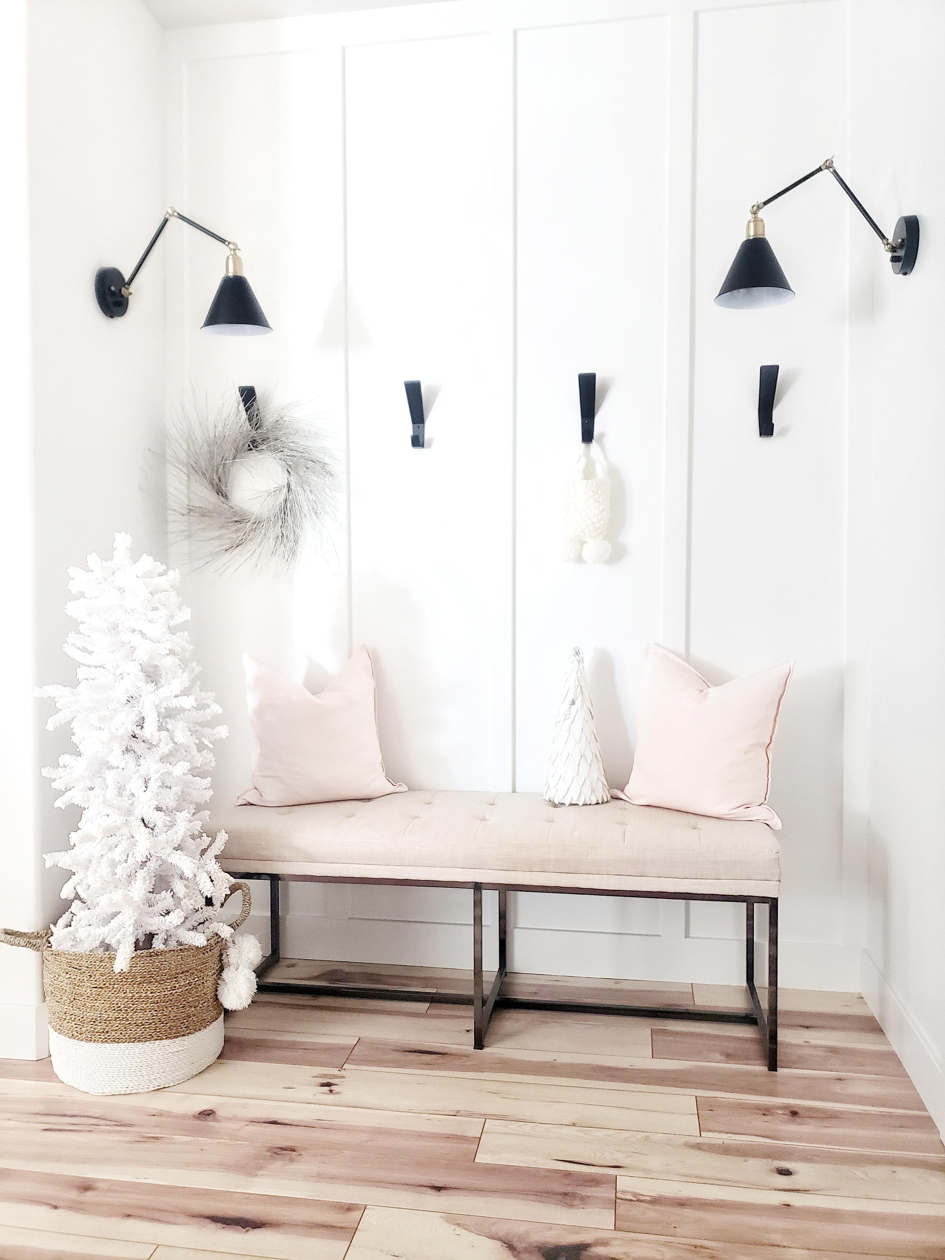The mudroom is the only spot I kept some pink. The pink pillows from fall stayed while I added a simple white tree. I opted to leave it undecorated and just enjoy the simplicity. The fun wreath and small tree on the bench were some of the only glitter pieces I used this year. I limited the sparkle mess to the mudroom. 🙂