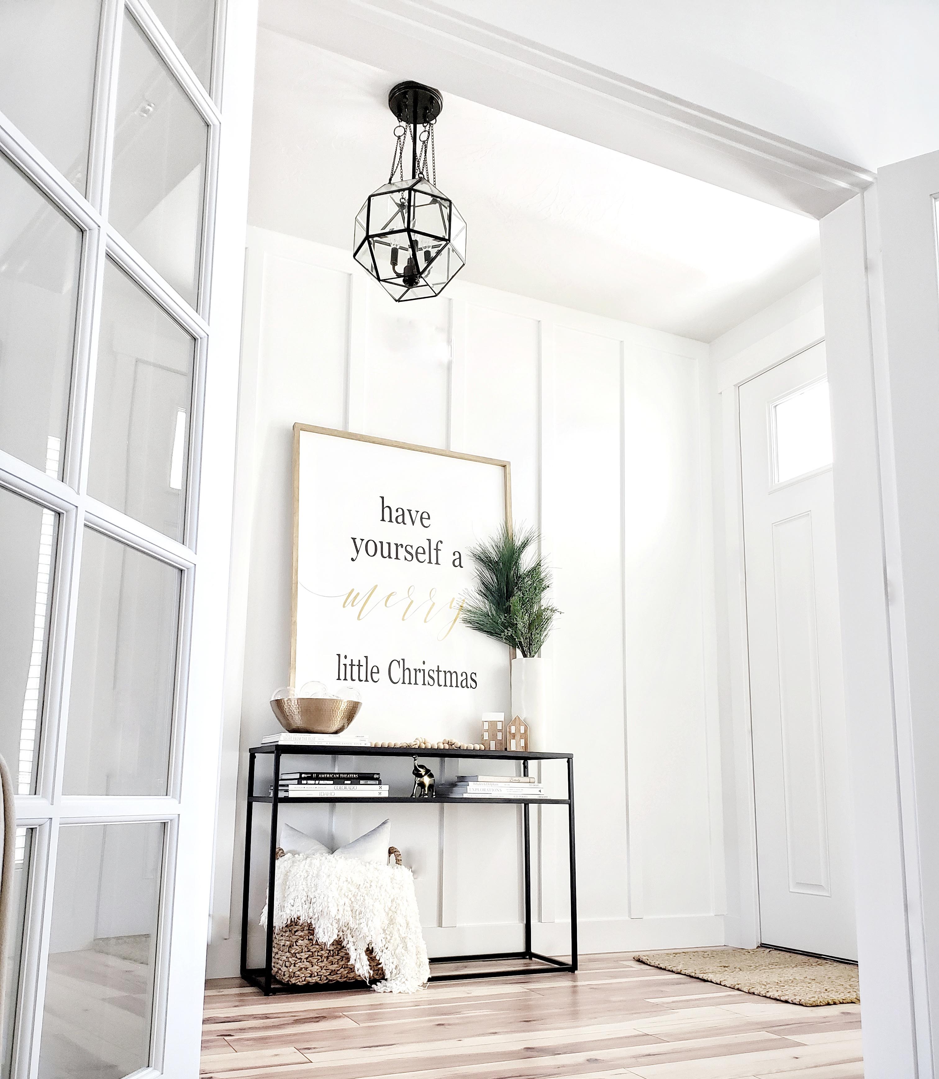 The entry was also simple with a bowl full of clear ornaments and some greenery. I snagged the $5 houses at Target. The white and wood were just what this little spot needed. I also got the most amazing wood sign from Craft Me Up Decor. This sign is such a statement. I was beyond impressed with the quality. You can customize size, frame color, paint color, and choose from tons of designs. I really just love everything about it! Be sure to go check out Jaesie’s cute little shop.