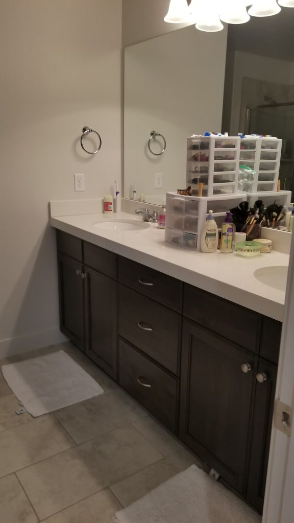 The bathrooms upstairs needed some cosmetic updates to fit our style. I wanted to create a space that would be functional and stylish. I have said it so many times but I will say it again. One of the easiest ways to update a space or give it some character is with lighting. I knew that the builder basic light fixtures just had to go. Here is a look at the master bathroom when we bought the house.