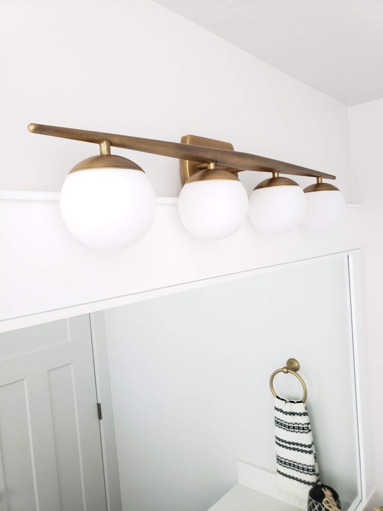 The kid’s bathroom also needed a little lighting love. I will be honest, I had a hard time deciding which bathroom should get this Jasper Bath Light. It is so unique, modern, and retro all at the same time. I ended up deciding it fit best in the kid’s bathroom. You know I love all things brass. So, it is no surprise on the color choice. The tapered bar with etched cased opal globes is striking. The Jasper Bath Light is just what this bathroom needed to pop. Instead of removing the mirror in here, we just added an easy DIY frame.