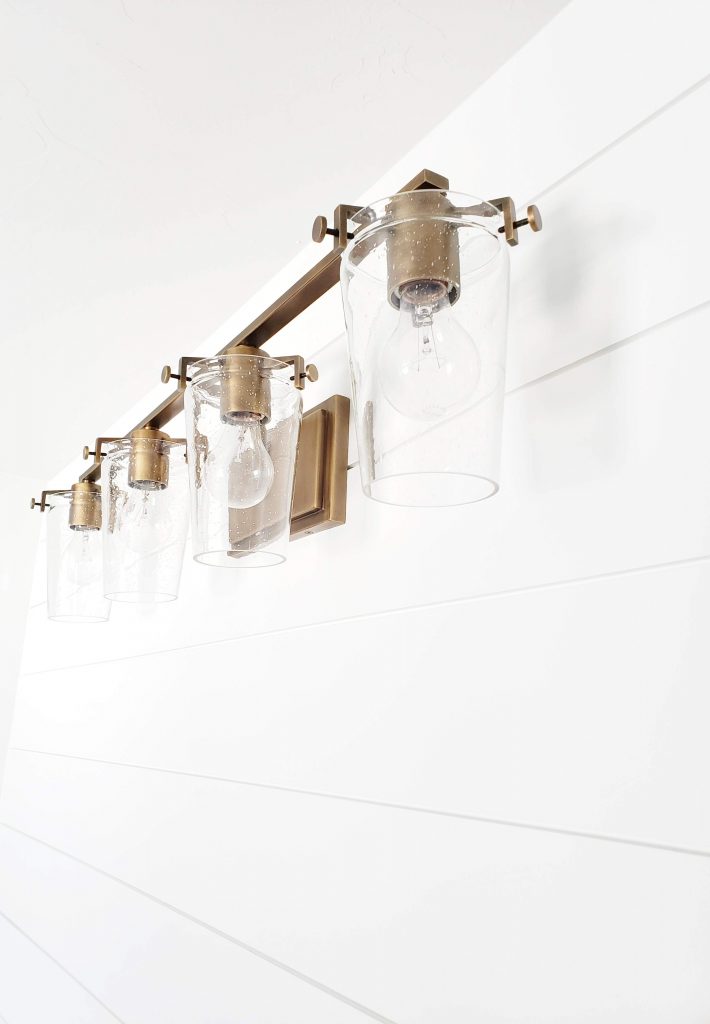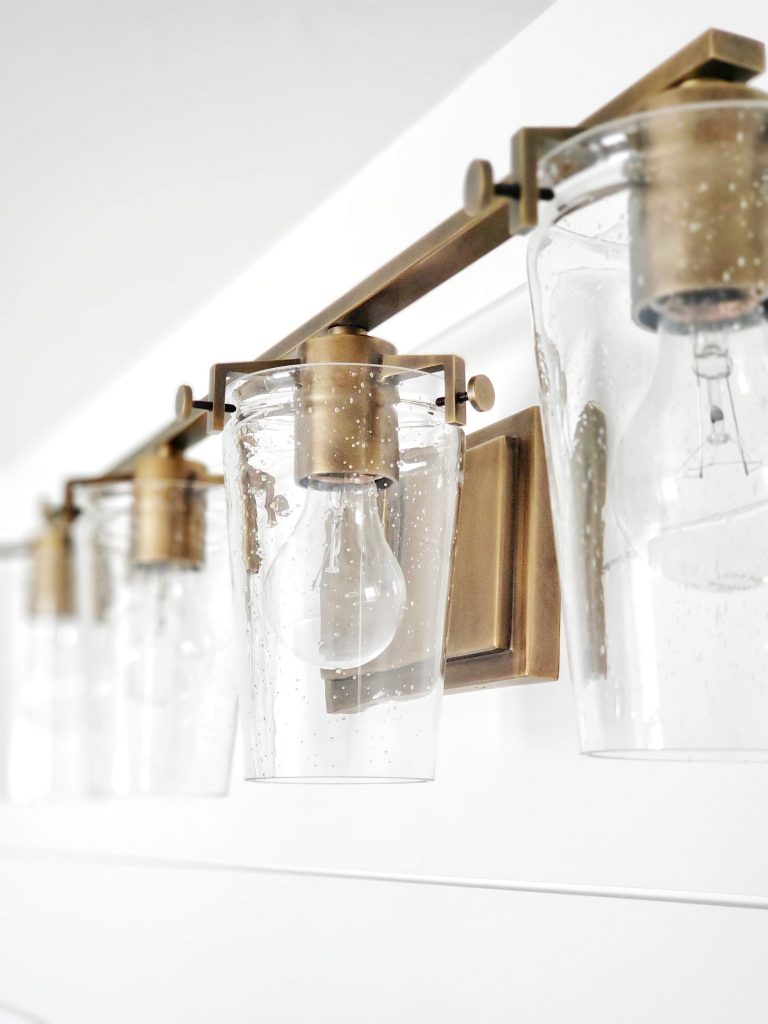 I really wish the previous owners had put light fixtures over each sink. However, there was only one light fixture for a double sink. 🙁 I decided to make the most of it and work with what we had. I knew that Kichler would have something amazing to give it a wow factor. Sure enough, I found the Alton Bath Light. The industrial brass plate and seeded glass were just perfect. I love how it pops against the white shiplap.