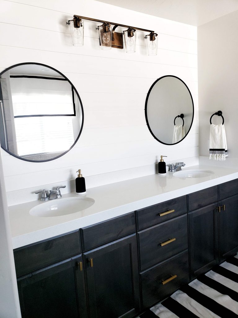 To give the master bathroom extra dimension and style we popped off the builder grade mirror. Mr. Whitelane and I decided to install shiplap and hang individual mirrors for each sink. The Alton Bath Light centered between the sinks really makes a statement. This is phase one of the bathroom updates. We plan on replacing the faucets/countertops and painting the vanities in phase two (after the basement is finished). Although, I kind of like the dark vanities for now.